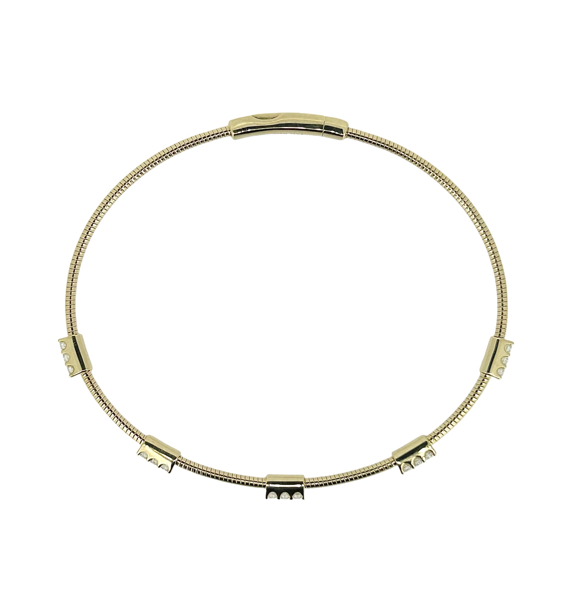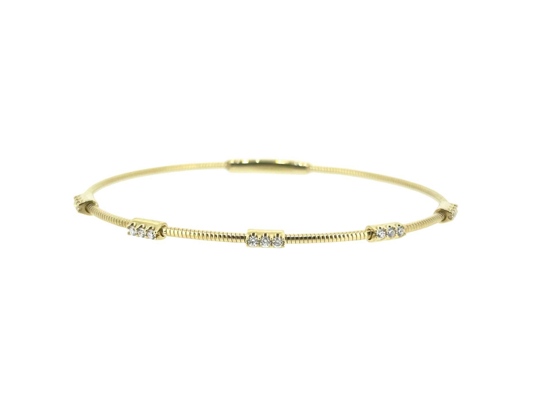 A sleek and contemporary 14K yellow gold diamond bangle bracelet, designed with a flexible snake-style band for a refined modern look. Accented with polished gold stations, each set with clusters of round brilliant-cut diamonds totaling 0.23 carats, this piece offers just the right touch of sparkle without overwhelming its elegant simplicity.