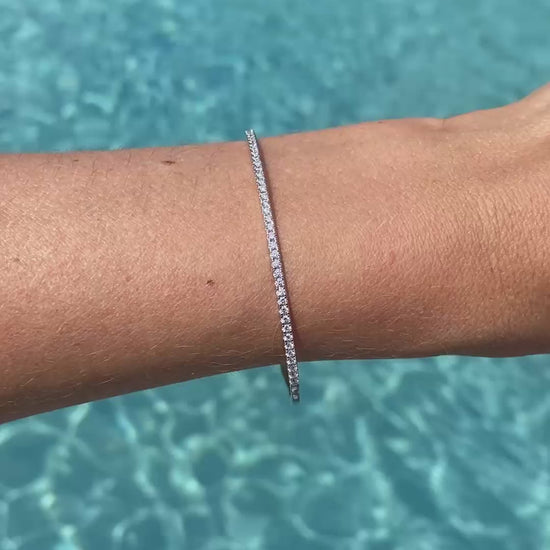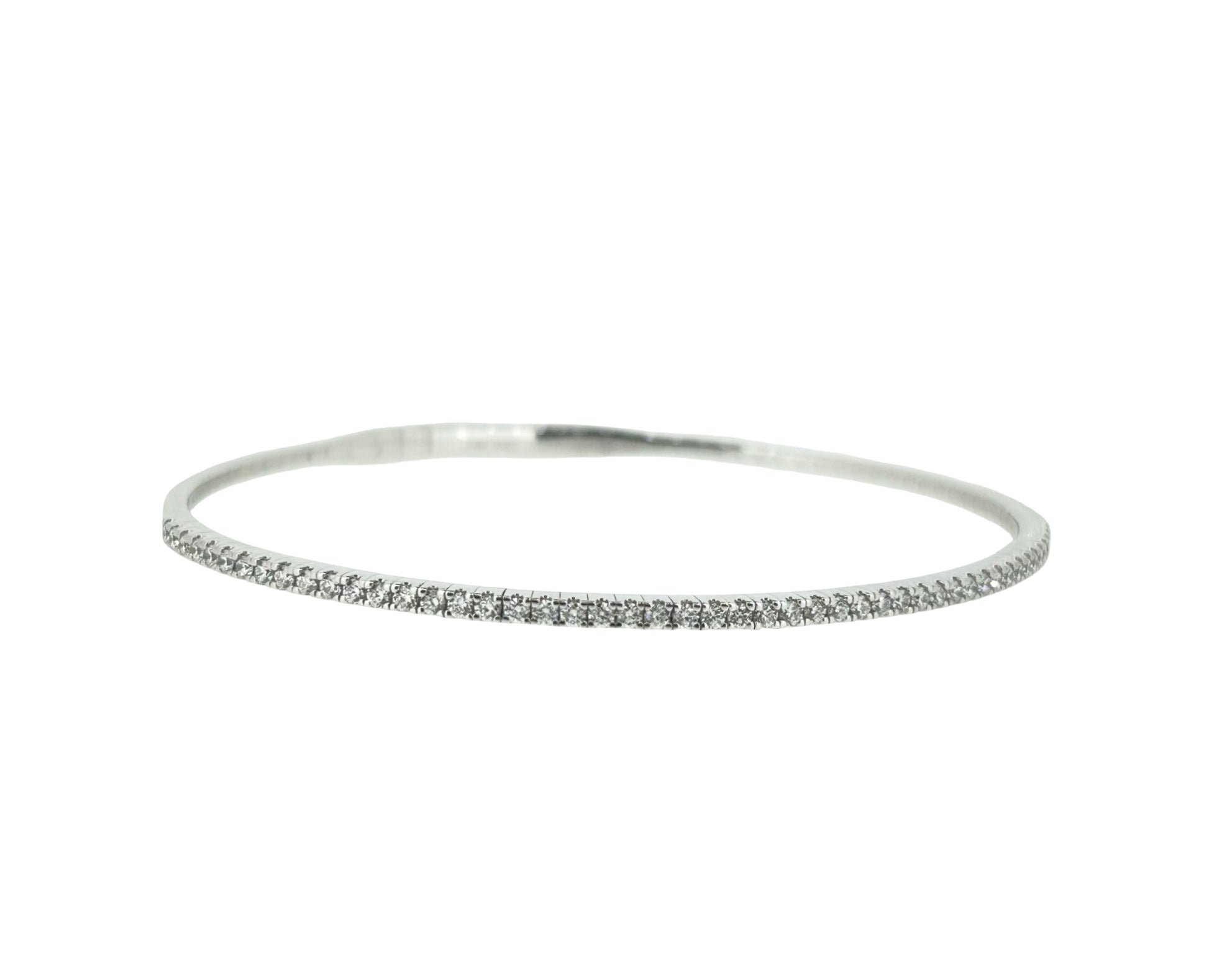 An elegant 14K white gold diamond bangle bracelet, designed with a slim, refined silhouette that radiates timeless beauty. The bracelet is adorned with a continuous row of round brilliant-cut diamonds, totaling 0.70 carats, creating a sleek line of sparkle that enhances its sophisticated style.