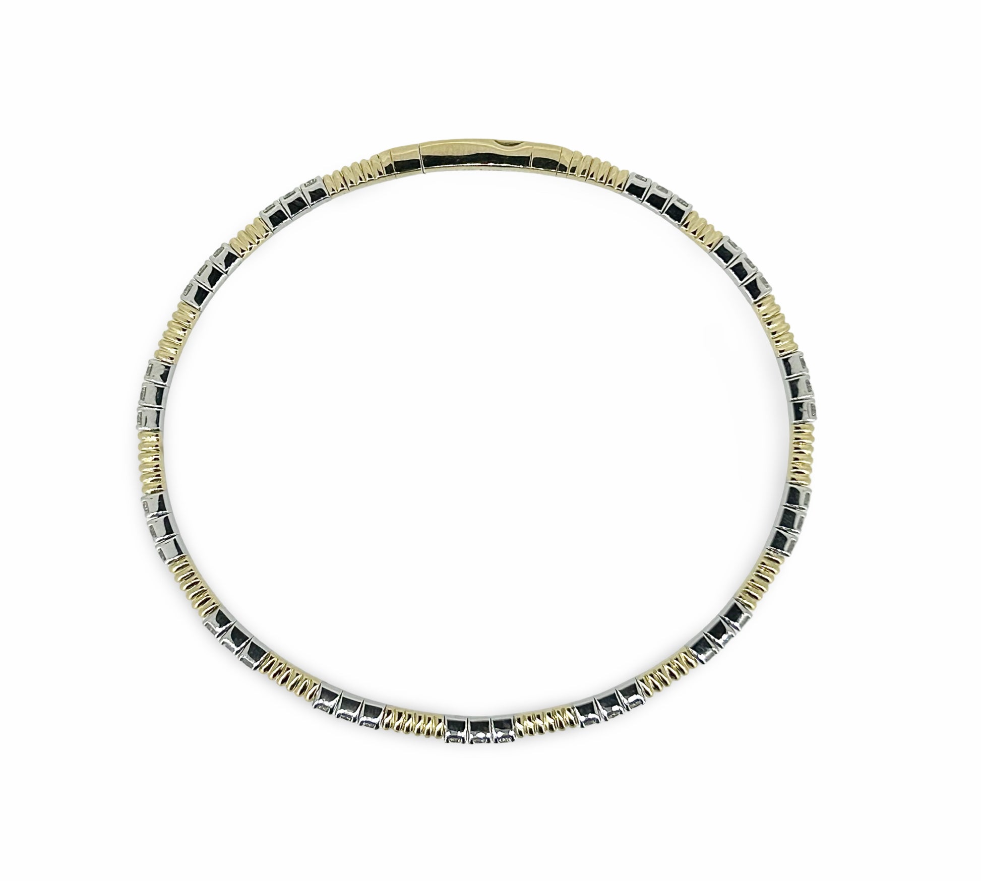 A striking two-tone diamond bangle bracelet crafted in 14K yellow gold and 14K white gold, offering a modern yet timeless contrast. The bracelet is accented with shimmering round brilliant-cut diamonds, with a total weight of 1.10 carats, set in alternating ribbed gold and smooth white sections for a unique, textured design.