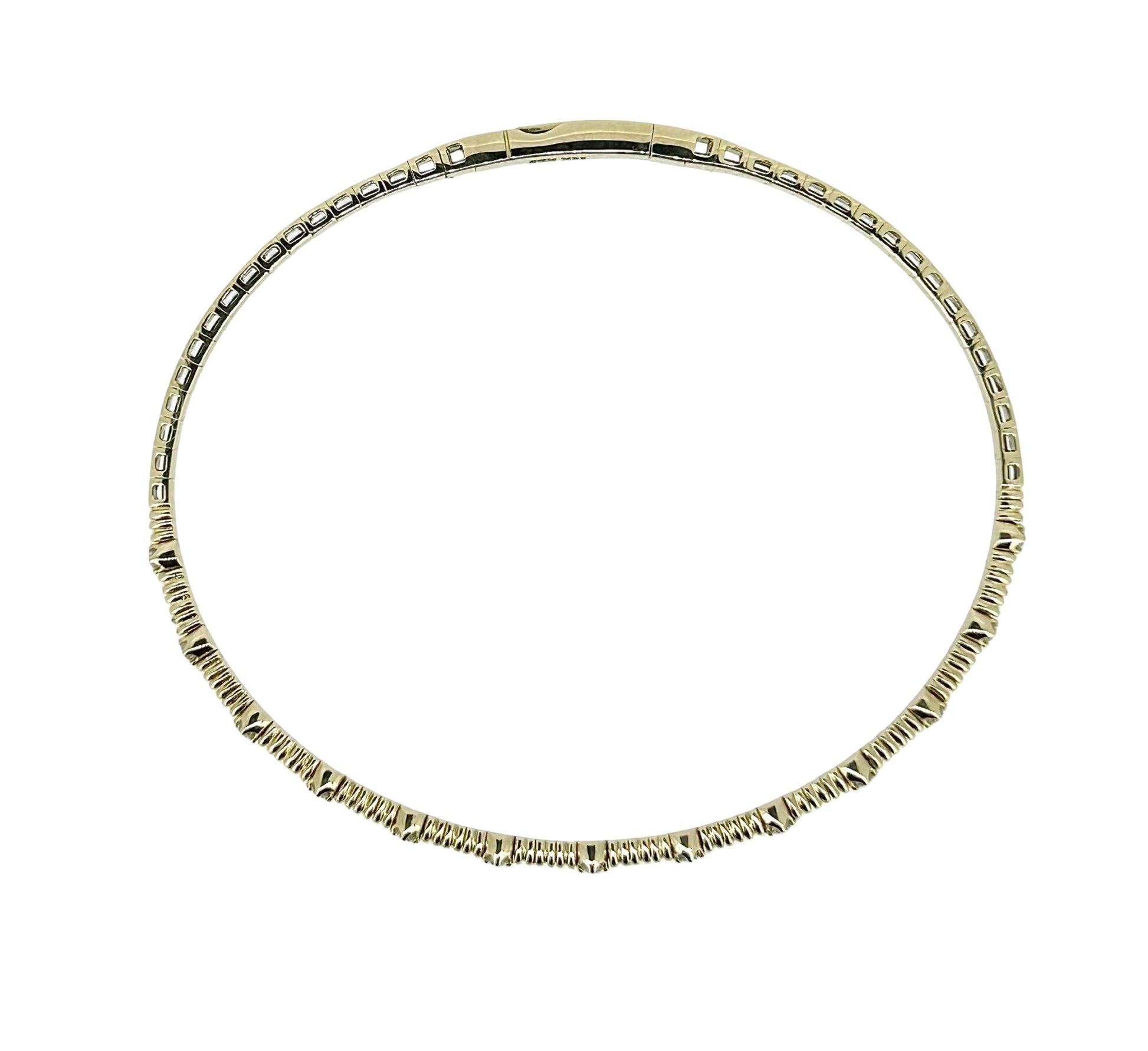 An elegant diamond bangle bracelet crafted in rich 14K yellow gold, designed with a textured ribbed finish that gives it a modern yet timeless look. Set along the bracelet are sparkling round brilliant-cut diamonds, totaling 0.20 carats, carefully spaced to add just the right amount of shimmer and sophistication.
