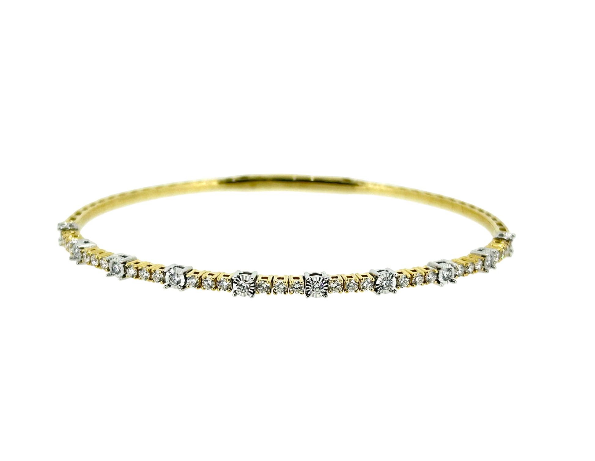 A sophisticated diamond line bangle bracelet crafted in radiant 14K yellow gold and 14K white gold, designed with alternating sections of sleek gold and shimmering white gold prongs for added contrast. Set along the bracelet are sparkling round brilliant-cut diamonds, with a total weight of 0.75 carats, creating a continuous band of brilliance around the wrist.